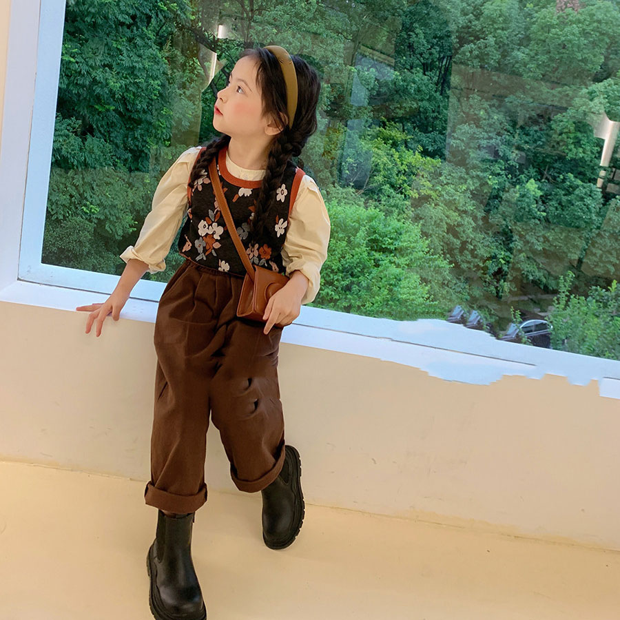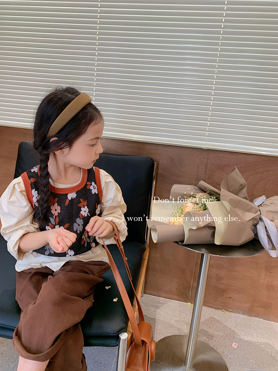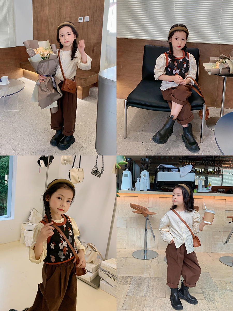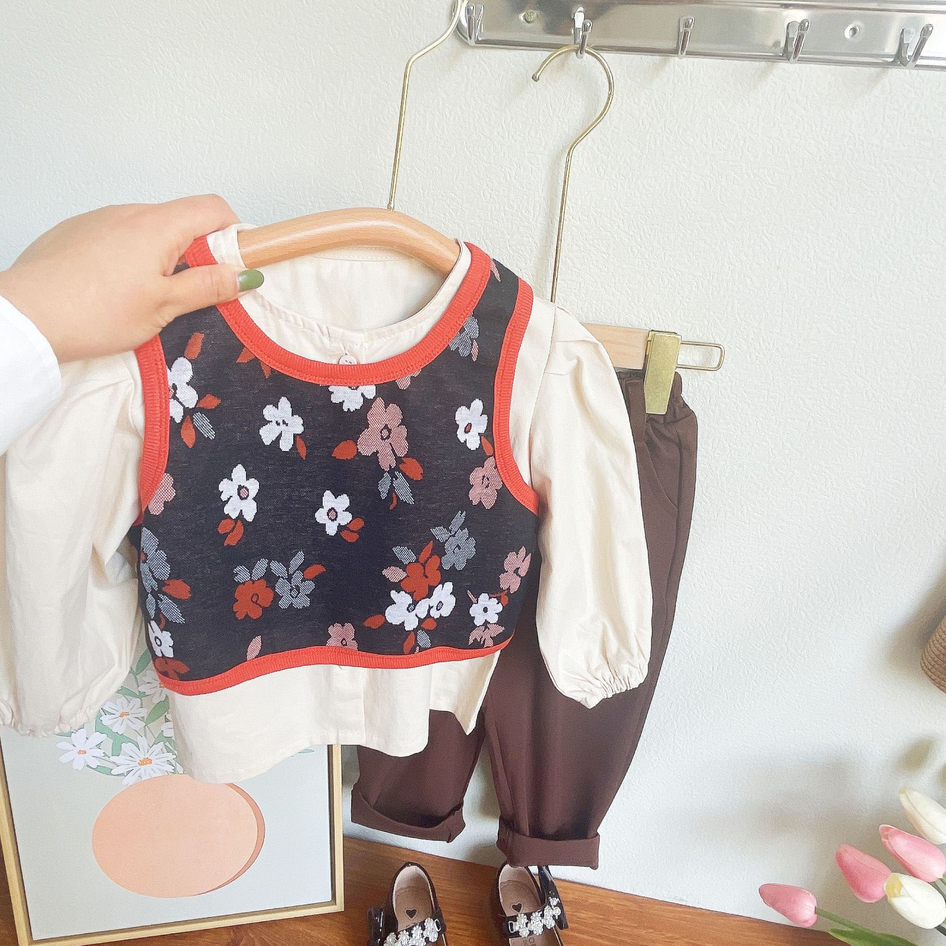 Infant clothing flower tank top+casual long sleeve shirt+pocket pant three piece dress for girls